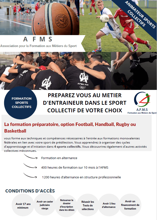 La formation préparatoire Animateur Sports Collectifs, option Football, Handball, Rugby ou Basketball vous forme sur une période de 10 mois aux techniques et compétences nécessaires à l’entrée aux formations monovalentes fédérales en lien avec votre sport de prédilection. Vous apprendrez à organiser des cycles d’apprentissage et d’initiation dans 4 sports collectifs. Vous découvrirez également d’autres activités collectives méconnues.